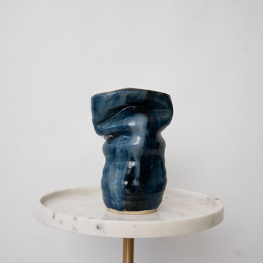 ארקל קרמי בעיצוב צילינדרי רחב, עם קימורים א סימטרים רכים שמעניקים לו תחושת תנועה זורמת ויד מלטפת של חומר. על גבי פני השטח נשפך גוון כחול עמוק, כמעין נוזל חי שמתפזר בשכבות ומציף את הכלי בגוונים משתנים. תוצאה עשירה, אמנותית ובלתי שגרתית – פריט שמושך מבטים ומשאיר רושם.